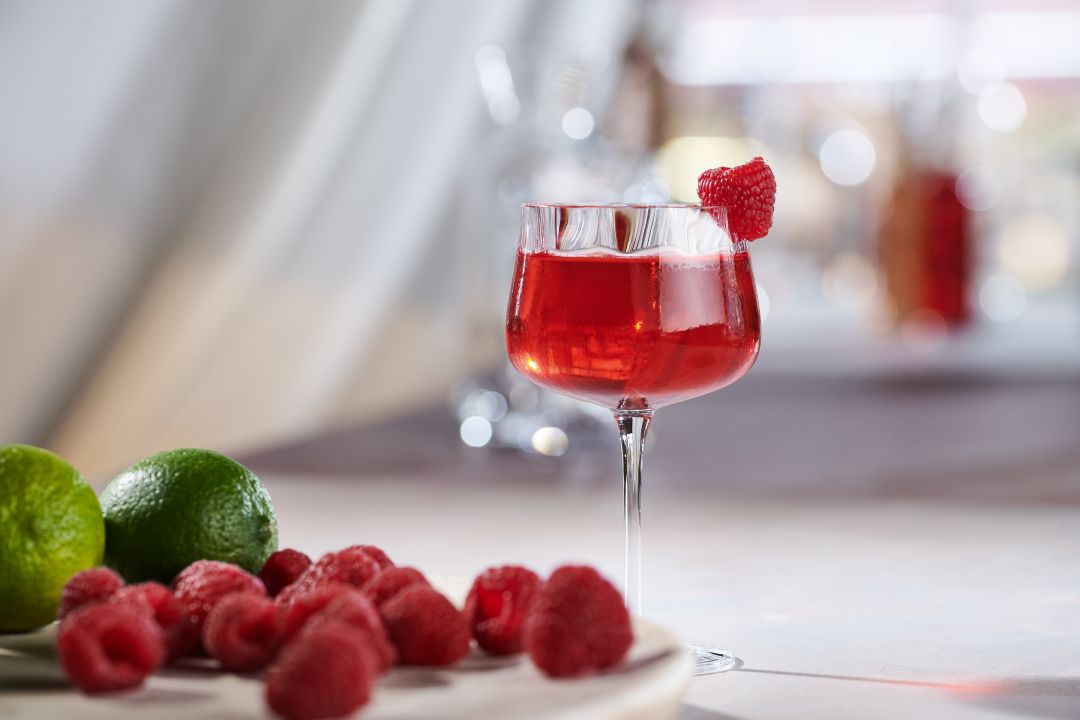 Fill ice, Mosko, Raspberry syrup and lime juice into the shaker.